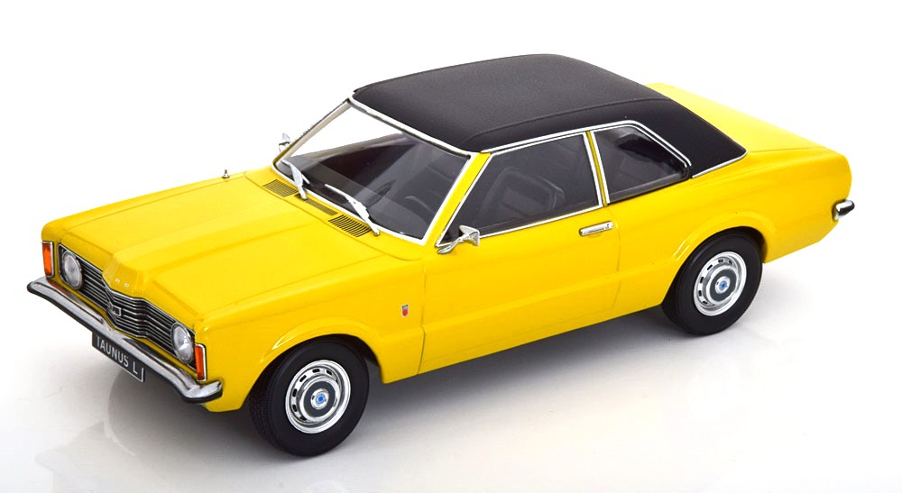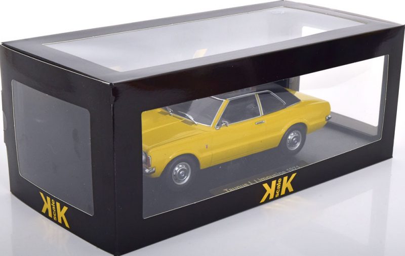 DIE CAST MODEL KK-SCALE FORD TAUNUS L SEDAN WITH VINYL ROOF ROUND HEADLIGHTS YELLOW MATT BLACK 1971 SCALE 1/18